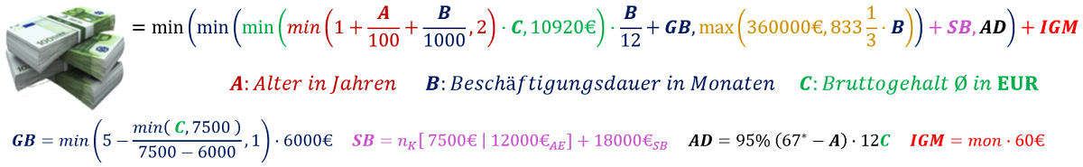 Grundbetrag 6.000 € bis Jahreseinkommen von 72.000 €, reduziert bis auf 0 bei 90.000 € (nur absolut gedeckelt). Sockelbeträge pro Kind 7.500 € oder 12.000 € für Allein- erziehende, 18.000 € bei Schwerbehinderung (GdB ≥ 50). Deckelung auf max. 10.920 € x Besch.jahre und absolut 360.000 € oder 10.000 € x Besch.jahre, falls höherer Wert, jedoch max. 95 % des Entgelts bis Regelaltersrente ⓘ; zzgl. nur für IGM Mitglieder |